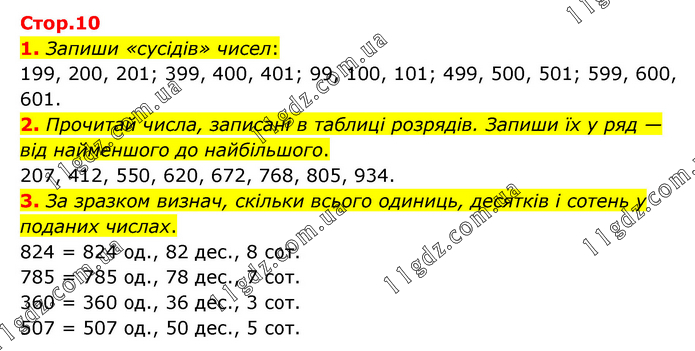 1. Запиши «сусідів» чисел: 199, 200, 201; 399, 400, 401; 99, 100, 101; 499, 500, 501; 599, 600, 601. 2. Прочитай числа, записані в таблиці розрядів. Запиши їх у ряд — від найменшого до найбільшого. 207, 412, 550, 620, 672, 768, 805, 934. 3. За зразком визнач, скільки всього одиниць, десятків і сотень у поданих числах. 824 = 824 од., 82 дес., 8 сот. 785 = 785 од., 78 дес., 7 сот. 360 = 360 од., 36 дес., 3 сот. 507 = 507 од., 50 дес., 5 сот.