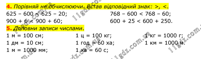 4. Порівняй не обчислюючи. Встав відповідний знак: >, <. 625 – 600 < 625 – 20; 900 + 6 < 900 + 60; 768 – 600 < 768 – 60; 600 + 25 < 600 + 250. 5. Доповни записи числами. 1 м = 100 см; 1 дм = 10 см; 1 м = 1000 мм; 1 ц = 100 кг; 1 год = 60 ха; 1 хв = 60 с; 1 кг = 1000 г; 1 км = 1000 м.