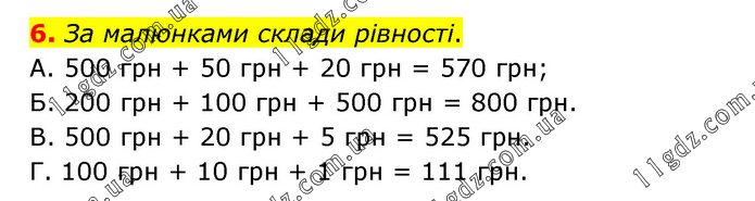 За малюнками склади рівності. А. 500 грн + 50 грн + 20 грн = 570 грн; Б. 200 грн + 100 грн + 500 грн = 800 грн. В. 500 грн + 20 грн + 5 грн = 525 грн. Г. 100 грн + 10 грн + 1 грн = 111 грн.