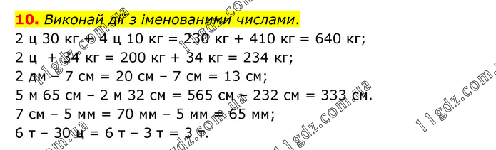 Виконай дії з іменованими числами. 2 ц 30 кг + 4 ц 10 кг = 230 кг + 410 кг = 640 кг; 2 ц + 34 кг = 200 кг + 34 кг = 234 кг; 2 дм – 7 см = 20 см – 7 см = 13 см; 5 м 65 см – 2 м 32 см = 565 см – 232 см = 333 см. 7 см – 5 мм = 70 мм – 5 мм = 65 мм; 6 т – 30 ц = 6 т – 3 т = 3 т.