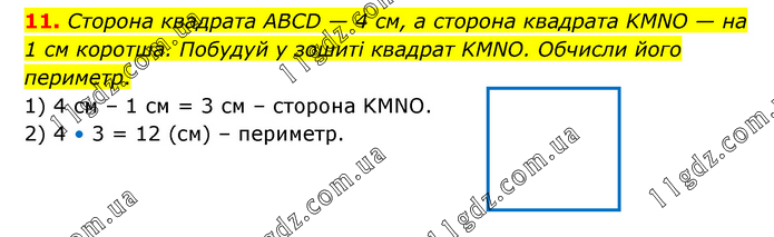 Сторона квадрата ABCD — 4 см, а сторона квадрата KMNO — на 1 см коротша. Побудуй у зошиті квадрат KMNO. Обчисли його периметр. 1) 4 см – 1 см = 3 см – сторона KMNO. 2) 4 • 3 = 12 (см) – периметр.