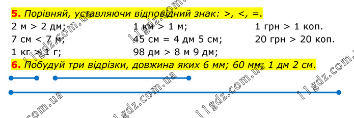 5. Порівняй, уставляючи відповідний знак: >, <, =. 2 м > 2 дм; 7 см < 7 м; 1 кг > 1 г; 1 км > 1 м; 45 см = 4 дм 5 см; 98 дм > 8 м 9 дм; 1 грн > 1 коп. 20 грн > 20 коп. 6. Побудуй три відрізки, довжина яких 6 мм; 60 мм; 1 дм 2 см.