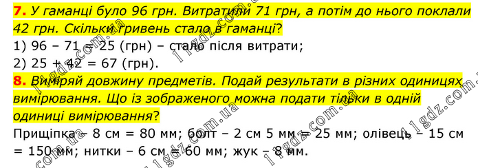 7. У гаманці було 96 грн. Витратили 71 грн, а потім до нього поклали 42 грн. Скільки гривень стало в гаманці? 1) 96 – 71 = 25 (грн) – стало після витрати; 2) 25 + 42 = 67 (грн). 8. Виміряй довжину предметів. Подай результати в різних одиницях вимірювання. Що із зображеного можна подати тільки в одній одиниці вимірювання? Прищіпка – 8 см = 80 мм; болт – 2 см 5 мм = 25 мм; олівець – 15 см = 150 мм; нитки – 6 см = 60 мм; жук – 8 мм.