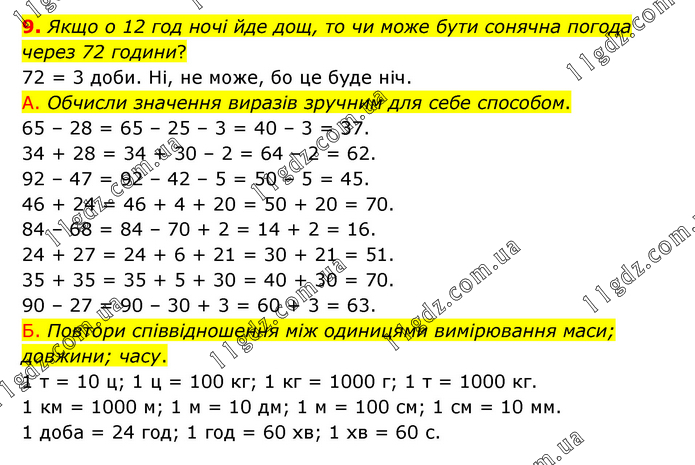 Якщо о 12 год ночі йде дощ, то чи може бути сонячна погода через 72 години? 72 = 3 доби. Ні, не може, бо це буде ніч. А. Обчисли значення виразів зручним для себе способом. 65 – 28 = 65 – 25 – 3 = 40 – 3 = 37. 34 + 28 = 34 + 30 – 2 = 64 – 2 = 62. 92 – 47 = 92 – 42 – 5 = 50 – 5 = 45. 46 + 24 = 46 + 4 + 20 = 50 + 20 = 70. 84 – 68 = 84 – 70 + 2 = 14 + 2 = 16. 24 + 27 = 24 + 6 + 21 = 30 + 21 = 51. 35 + 35 = 35 + 5 + 30 = 40 + 30 = 70. 90 – 27 = 90 – 30 + 3 = 60 + 3 = 63. Б. Повтори співвідношення між одиницями вимірювання маси; довжини; часу. 1 т = 10 ц; 1 ц = 100 кг; 1 кг = 1000 г; 1 т = 1000 кг. 1 км = 1000 м; 1 м = 10 дм; 1 м = 100 см; 1 см = 10 мм. 1 доба = 24 год; 1 год = 60 хв; 1 хв = 60 с.