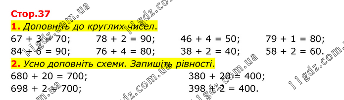 1. Доповніть до круглих чисел. 67 + 3 = 70; 84 + 6 = 90; 78 + 2 = 90; 76 + 4 = 80; 46 + 4 = 50; 38 + 2 = 40; 79 + 1 = 80; 58 + 2 = 60. 2. Усно доповніть схеми. Запишіть рівності. 680 + 20 = 700; 698 + 2 = 700; 380 + 20 = 400; 398 + 2 = 400.