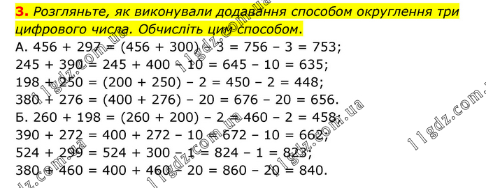 Розгляньте, як виконували додавання способом округлення три цифрового числа. Обчисліть цим способом. А. 456 + 297 = (456 + 300) – 3 = 756 – 3 = 753; 245 + 390 = 245 + 400 – 10 = 645 – 10 = 635; 198 + 250 = (200 + 250) – 2 = 450 – 2 = 448; 380 + 276 = (400 + 276) – 20 = 676 – 20 = 656. Б. 260 + 198 = (260 + 200) – 2 = 460 – 2 = 458; 390 + 272 = 400 + 272 – 10 = 672 – 10 = 662; 524 + 299 = 524 + 300 – 1 = 824 – 1 = 823; 380 + 460 = 400 + 460 – 20 = 860 – 20 = 840.