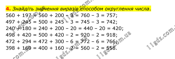 Знайдіть значення виразів способом округлення числа. 560 + 197 = 560 + 200 – 3 = 760 – 3 = 757; 497 + 245 = 500 + 245 – 3 = 745 – 3 = 742; 240 + 180 = 240 + 200 – 20 = 440 – 20 = 420; 498 + 420 = 500 + 420 – 2 = 920 – 2 = 918; 472 + 294 = 472 + 300 – 6 = 772 – 6 = 766; 398 + 160 = 400 + 160 – 2 = 560 – 2 = 558.