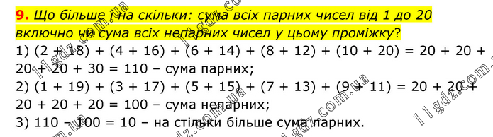 Що більше і на скільки: сума всіх парних чисел від 1 до 20 включно чи сума всіх непарних чисел у цьому проміжку? 1) (2 + 18) + (4 + 16) + (6 + 14) + (8 + 12) + (10 + 20) = 20 + 20 + 20 + 20 + 30 = 110 – сума парних; 2) (1 + 19) + (3 + 17) + (5 + 15) + (7 + 13) + (9 + 11) = 20 + 20 + 20 + 20 + 20 = 100 – сума непарних; 3) 110 – 100 = 10 – на стільки більше сума парних.