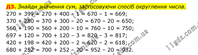 Знайди значення сум, застосовуючи спосіб округлення числа. 270 + 399 = 270 + 400 – 1 = 670 – 1 = 669; 370 + 280 = 370 + 300 – 20 = 670 – 20 = 650; 560 + 190 = 560 + 200 – 10 = 760 – 10 = 750; 697 + 120 = 700 + 120 – 3 = 820 – 3 = 817; 420 + 198 = 420 + 200 – 2 = 620 – 2 = 618; 680 + 252 = 700 + 252 – 20 = 952 – 20 = 932.