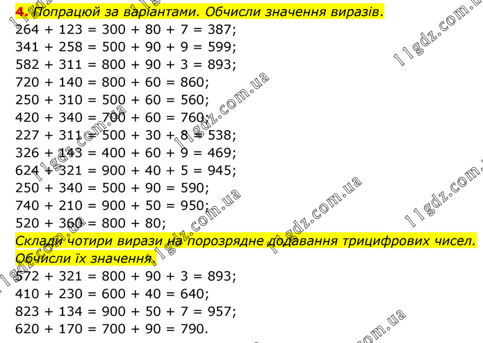 Попрацюй за варіантами. Обчисли значення виразів. 264 + 123 = 300 + 80 + 7 = 387; 341 + 258 = 500 + 90 + 9 = 599; 582 + 311 = 800 + 90 + 3 = 893; 720 + 140 = 800 + 60 = 860; 250 + 310 = 500 + 60 = 560; 420 + 340 = 700 + 60 = 760; 227 + 311 = 500 + 30 + 8 = 538; 326 + 143 = 400 + 60 + 9 = 469; 624 + 321 = 900 + 40 + 5 = 945; 250 + 340 = 500 + 90 = 590; 740 + 210 = 900 + 50 = 950; 520 + 360 = 800 + 80; Склади чотири вирази на порозрядне додавання трицифрових чисел. Обчисли їх значення. 572 + 321 = 800 + 90 + 3 = 893; 410 + 230 = 600 + 40 = 640; 823 + 134 = 900 + 50 + 7 = 957; 620 + 170 = 700 + 90 = 790.