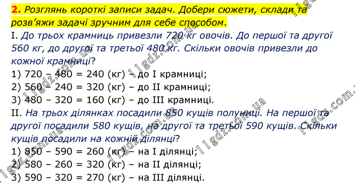 Розглянь короткі записи задач. Добери сюжети, склади та розв’яжи задачі зручним для себе способом. І. До трьох крамниць привезли 720 кг овочів. До першої та другої 560 кг, до другої та третьої 480 кг. Скільки овочів привезли до кожної крамниці? 1) 720 – 480 = 240 (кг) – до І крамниці; 2) 560 – 240 = 320 (кг) – до ІІ крамниці; 3) 480 – 320 = 160 (кг) – до ІІІ крамниці. ІІ. На трьох ділянках посадили 850 кущів полуниці. На першої та другої посадили 580 кущів, на другої та третьої 590 кущів. Скільки кущів посадили на кожній ділянці? 1) 850 – 590 = 260 (кг) – на І ділянці; 2) 580 – 260 = 320 (кг) – на ІІ ділянці; 3) 590 – 320 = 270 (кг) – на ІІІ ділянці.