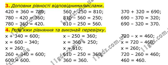 3. Доповни рівності відповідними числами. 420 + 360 = 780; 780 – 420 = 360; 780 – 360 = 420. 560 + 250 = 810; 810 – 560 = 250; 810 – 250 = 560. 370 + 320 = 690; 690 – 370 = 320; 690 – 320 = 370. 4. Розв’яжи рівняння та виконай перевірку. х + 340 = 600; х = 600 – 340; х = 260; 260 + 340 = 600; 600 = 600. х – 250 = 360; х = 360 + 250; х = 610; 610 – 250 = 360; 360 = 360. 720 – х = 460; х = 720 – 460; х = 260; 720 – 260 = 460; 460 = 460.
