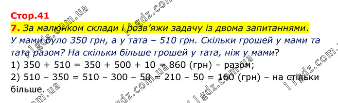 7. За малюнком склади і розв’яжи задачу із двома запитаннями. У мами було 350 грн, а у тата – 510 грн. Скільки грошей у мами та тата разом? На скільки більше грошей у тата, ніж у мами? 1) 350 + 510 = 350 + 500 + 10 = 860 (грн) – разом; 2) 510 – 350 = 510 – 300 – 50 = 210 – 50 = 160 (грн) – на стільки більше.