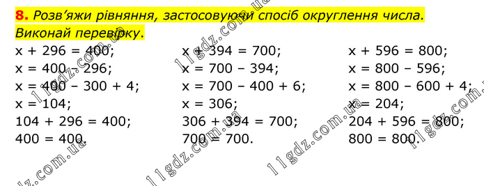 Розв’яжи рівняння, застосовуючи спосіб округлення числа. Виконай перевірку. х + 296 = 400; х = 400 – 296; х = 400 – 300 + 4; х = 104; 104 + 296 = 400; 400 = 400. х + 394 = 700; х = 700 – 394; х = 700 – 400 + 6; х = 306; 306 + 394 = 700; 700 = 700. х + 596 = 800; х = 800 – 596; х = 800 – 600 + 4; х = 204; 204 + 596 = 800; 800 = 800.