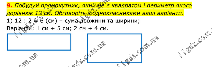 Побудуй прямокутник, який не є квадратом і периметр якого дорівнює 12 см. Обговоріть з однокласниками ваші варіанти. 1) 12 : 2 = 6 (см) – сума довжини та ширини; Варіанти: 1 см + 5 см; 2 см + 4 см.