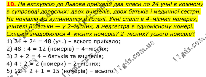 На екскурсію до Львова приїхали два класи по 24 учні в кожному в супроводі дорослих: двох вчителів, двох батьків і медичної сестри. Ha ночівлю всі зупинилися в готелі. Учні спали в 4–місних номерах, учителі й батьки — у 2–місних, а медсестра в одномісному номері. Скільки знадобилося 4–місних номерів? 2–місних? усього номерів? 1) 24 + 24 = 48 (уч.) – всього приїхало; 2) 48 : 4 = 12 (номерів) – 4–місних; 3) 2 + 2 = 4 – батьків та вчителів; 4) 4 : 2 = 2 (номери) – 2–місних; 5) 12 + 2 + 1 = 15 (номерів) – всього.