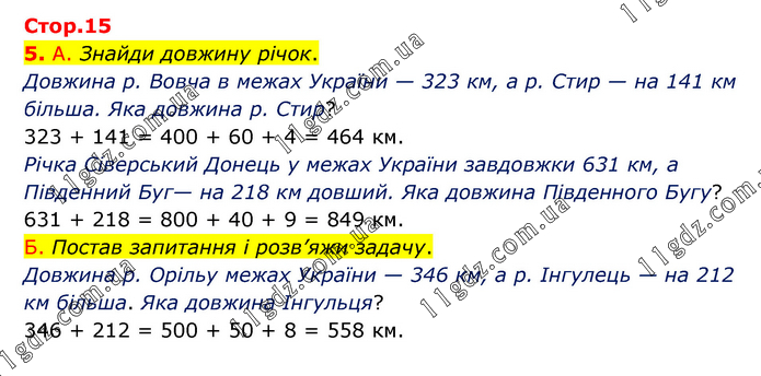 А. Знайди довжину річок. Довжина р. Вовча в межах України — 323 км, а р. Стир — на 141 км більша. Яка довжина р. Стир? 323 + 141 = 400 + 60 + 4 = 464 км. Річка Сіверський Донець у межах України завдовжки 631 км, а Південний Буг— на 218 км довший. Яка довжина Південного Бугу? 631 + 218 = 800 + 40 + 9 = 849 км. Б. Постав запитання і розв’яжи задачу. Довжина р. Орільу межах України — 346 км, а р. Інгулець — на 212 км більша. Яка довжина Інгульця? 346 + 212 = 500 + 50 + 8 = 558 км.