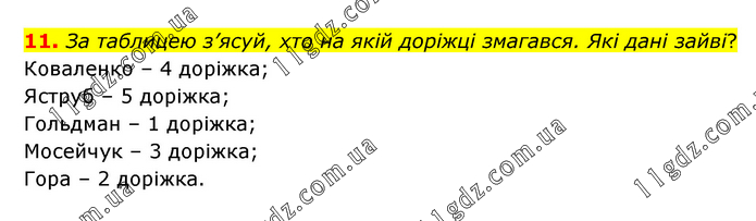 За таблицею з’ясуй, хто на якій доріжці змагався. Які дані зайві? Коваленко – 4 доріжка; Яструб – 5 доріжка; Гольдман – 1 доріжка; Мосейчук – 3 доріжка; Гора – 2 доріжка.