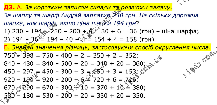А. За коротким записом склади та розв’яжи задачу. За шапку та шарф Андрій заплатив 230 грн. На скільки дорожча шапка, ніж шарф, якщо ціна шапки 194 грн? 1) 230 – 194 = 230 – 200 + 6 = 30 + 6 = 36 (грн) – ціна шарфа; 2) 194 – 36 = 194 – 40 + 4 = 154 + 4 = 158 (грн). Б. Знайди значення різниць, застосовуючи спосіб округлення числа. 750 – 398 = 750 – 400 + 2 = 350 + 2 = 352; 840 – 480 = 840 – 500 + 20 = 340 + 20 = 360; 450 – 297 = 450 – 300 + 3 = 150 + 3 = 153; 920 – 194 = 920 – 200 + 6 = 720 + 6 = 726; 670 – 290 = 670 – 300 + 10 = 370 + 10 = 380; 530 – 180 = 530 – 200 + 20 = 330 + 20 = 350.