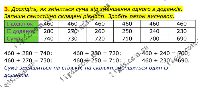 Дослідіть, як зміниться сума від зменшення одного з доданків. Запиши самостійно складені рівності. Зробіть разом висновок. 460 + 280 = 740; 460 + 270 = 730; 460 + 260 = 720; 460 + 250 = 710; 460 + 240 = 700; 460 + 230 = 690. Сума зменшиться на стільки, на скільки зменшиться один із доданків.