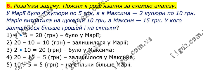 Розв’яжи задачу. Поясни її розв’язання за схемою аналізу. У Марії було 4 купюри по 5 грн, а в Максима — 2 купюри по 10 грн. Марія витратила на цукерки 10 грн, а Максим — 15 грн. У кого залишилося більше грошей і на скільки? 1) 4 • 5 = 20 (грн) – було у Марії; 2) 20 – 10 = 10 (грн) – залишилося у Марії; 3) 2 • 10 = 20 (грн) – було у Максима; 4) 20 – 15 = 5 (грн) – залишилося у Максима; 5) 10 – 5 = 5 (грн) – на стільки більше Марії.