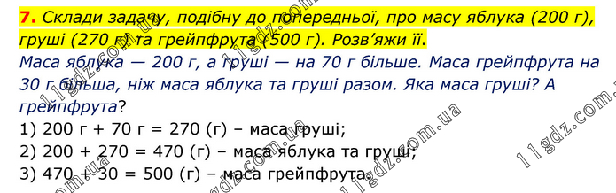 Склади задачу, подібну до попередньої, про масу яблука (200 г), груші (270 г) та грейпфрута (500 г). Розв’яжи її. Маса яблука — 200 г, а груші — на 70 г більше. Маса грейпфрута на 30 г більша, ніж маса яблука та груші разом. Яка маса груші? А грейпфрута? 1) 200 г + 70 г = 270 (г) – маса груші; 2) 200 + 270 = 470 (г) – маса яблука та груші; 3) 470 + 30 = 500 (г) – маса грейпфрута.