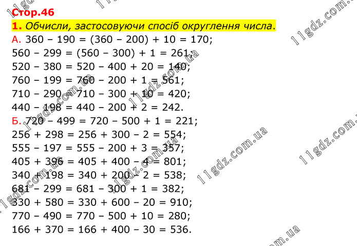 Обчисли, застосовуючи спосіб округлення числа. А. 360 – 190 = (360 – 200) + 10 = 170; 560 – 299 = (560 – 300) + 1 = 261; 520 – 380 = 520 – 400 + 20 = 140; 760 – 199 = 760 – 200 + 1 = 561; 710 – 290 = 710 – 300 + 10 = 420; 440 – 198 = 440 – 200 + 2 = 242. Б. 720 – 499 = 720 – 500 + 1 = 221; 256 + 298 = 256 + 300 – 2 = 554; 555 – 197 = 555 – 200 + 3 = 357; 405 + 396 = 405 + 400 – 4 = 801; 340 + 198 = 340 + 200 – 2 = 538; 681 – 299 = 681 – 300 + 1 = 382; 330 + 580 = 330 + 600 – 20 = 910; 770 – 490 = 770 – 500 + 10 = 280; 166 + 370 = 166 + 400 – 30 = 536.