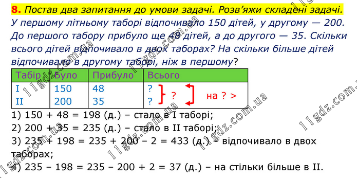 Постав два запитання до умови задачі. Розв’яжи складені задачі. У першому літньому таборі відпочивало 150 дітей, у другому — 200. До першого табору прибуло ще 48 дітей, а до другого — 35. Скільки всього дітей відпочивало в двох таборах? На скільки більше дітей відпочивало в другому таборі, ніж в першому? 1) 150 + 48 = 198 (д.) – стало в І таборі; 2) 200 + 35 = 235 (д.) – стало в ІІ таборі; 3) 235 + 198 = 235 + 200 – 2 = 433 (д.) – відпочивало в двох таборах; 4) 235 – 198 = 235 – 200 + 2 = 37 (д.) – на стільки більше в ІІ.