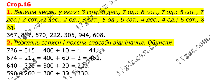 1. Запиши числа, у яких: 3 сот., б дес., 7 од.; 8 сот., 7 од.; 5 сот., 7 дес.; 2 сот., 2 дес., 2 од.; З сот., 5 од.; 9 сот., 4 дес., 4 од.; 6 сот., 8 од. 367, 807, 570, 222, 305, 944, 608. 2. Розглянь записи і поясни способи віднімання. Обчисли. 726 – 315 = 400 + 10 + 1 = 411. 674 – 212 = 400 + 60 + 2 = 462. 640 – 320 = 300 + 20 = 320. 590 – 260 = 300 + 30 = 330.