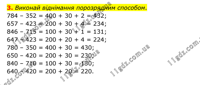 Виконай віднімання порозрядним способом. 784 – 352 = 400 + 30 + 2 = 432; 657 – 423 = 200 + 30 + 4 = 234; 846 – 715 = 100 + 30 + 1 = 131; 647 – 423 = 200 + 20 + 4 = 224; 780 – 350 = 400 + 30 = 430; 650 – 420 = 200 + 30 = 230; 840 – 710 = 100 + 30 = 130; 640 – 420 = 200 + 20 = 220.