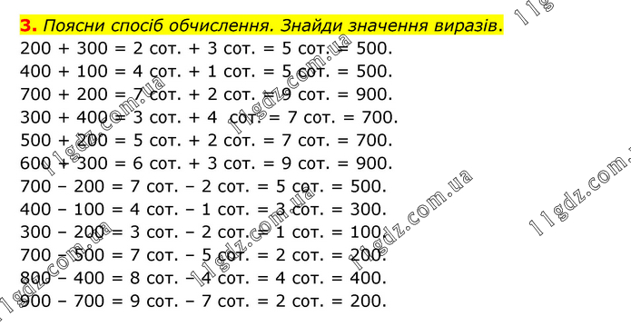 Поясни спосіб обчислення. Знайди значення виразів. 200 + 300 = 2 сот. + 3 сот. = 5 сот. = 500. 400 + 100 = 4 сот. + 1 сот. = 5 сот. = 500. 700 + 200 = 7 сот. + 2 сот. = 9 сот. = 900. 300 + 400 = 3 сот. + 4 сот. = 7 сот. = 700. 500 + 200 = 5 сот. + 2 сот. = 7 сот. = 700. 600 + 300 = 6 сот. + 3 сот. = 9 сот. = 900. 700 – 200 = 7 сот. – 2 сот. = 5 сот. = 500. 400 – 100 = 4 сот. – 1 сот. = 3 сот. = 300. 300 – 200 = 3 сот. – 2 сот. = 1 сот. = 100. 700 – 500 = 7 сот. – 5 сот. = 2 сот. = 200. 800 – 400 = 8 сот. – 4 сот. = 4 сот. = 400. 900 – 700 = 9 сот. – 7 сот. = 2 сот. = 200.