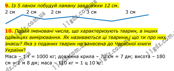 Подай іменовані числа, що характеризують тварин, в інших одиницях вимірювання. Як називаються ці тварини і що ти про них знаєш? Яка з поданих тварин не занесена до Червоної книги України? Маса – 1 т = 1000 кг; довжина крила – 70 см = 7 дм; висота – 180 см = 1 м 8 дм; маса – 110 кг = 1 ц 10 кг.