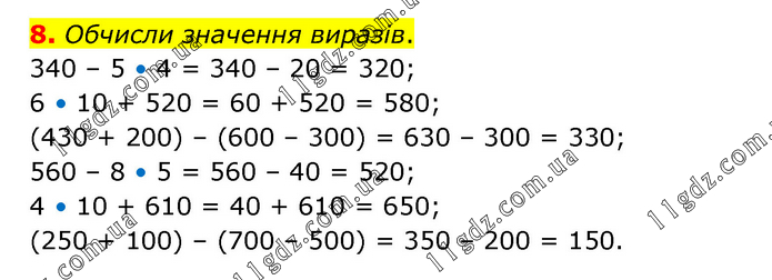Обчисли значення виразів. 340 – 5 • 4 = 340 – 20 = 320; 6 • 10 + 520 = 60 + 520 = 580; (430 + 200) – (600 – 300) = 630 – 300 = 330; 560 – 8 • 5 = 560 – 40 = 520; 4 • 10 + 610 = 40 + 610 = 650; (250 + 100) – (700 – 500) = 350 – 200 = 150.