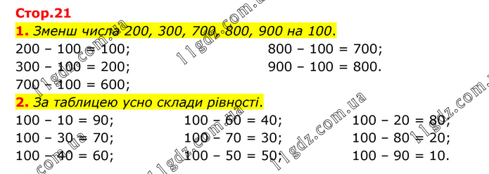 1. Зменш числа 200, 300, 700, 800, 900 на 100. 200 – 100 = 100; 300 – 100 = 200; 700 – 100 = 600; 800 – 100 = 700; 900 – 100 = 800. 2. За таблицею усно склади рівності. 100 – 10 = 90; 100 – 30 = 70; 100 – 40 = 60; 100 – 60 = 40; 100 – 70 = 30; 100 – 50 = 50; 100 – 20 = 80; 100 – 80 = 20; 100 – 90 = 10.