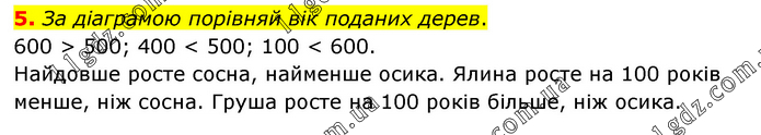 За діаграмою порівняй вік поданих дерев. 600 > 500; 400 < 500; 100 < 600. Найдовше росте сосна, найменше осика. Ялина росте на 100 років менше, ніж сосна. Груша росте на 100 років більше, ніж осика.