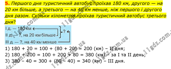 Першого дня туристичний автобус проїхав 180 км, другого — на 20 км більше, а третього — на 40 км менше, ніж першого і другого дня разом. Скільки кілометрів проїхав туристичний автобус третього дня? 1) 180 + 20 = 100 + (80 + 20) = 200 (км) – ІІ дня; 2) 180 + 200 = 100 + 200 + 80 = 380 (км) – за І та ІІ день; 3) 380 – 40 = 300 + (80 – 40) = 340 (км) – ІІІ дня.