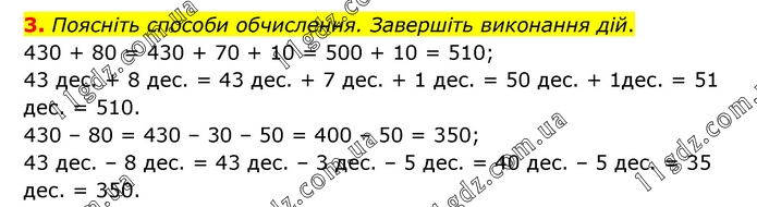 Поясніть способи обчислення. Завершіть виконання дій. 430 + 80 = 430 + 70 + 10 = 500 + 10 = 510; 43 дес. + 8 дес. = 43 дес. + 7 дес. + 1 дес. = 50 дес. + 1дес. = 51 дес. = 510. 430 – 80 = 430 – 30 – 50 = 400 – 50 = 350; 43 дес. – 8 дес. = 43 дес. – 3 дес. – 5 дес. = 40 дес. – 5 дес. = 35 дес. = 350.