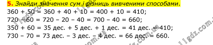 Знайди значення сум і різниць вивченими способами. 360 + 50 = 360 + 40 + 10 = 400 + 10 = 410; 720 – 60 = 720 – 20 – 40 = 700 – 40 = 660; 350 + 60 = 35 дес. + 5 дес. + 1 дес. = 41 дес. = 410; 730 – 70 = 73 дес. – 3 дес. – 4 дес. = 66 дес. = 660.