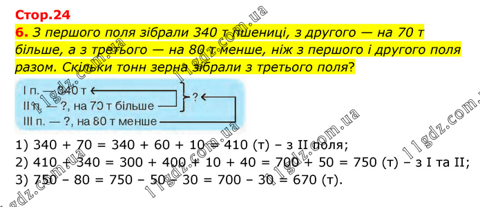 З першого поля зібрали 340 т пшениці, з другого — на 70 т більше, а з третього — на 80 т менше, ніж з першого і другого поля разом. Скільки тонн зерна зібрали з третього поля? 1) 340 + 70 = 340 + 60 + 10 = 410 (т) – з ІІ поля; 2) 410 + 340 = 300 + 400 + 10 + 40 = 700 + 50 = 750 (т) – з І та ІІ; 3) 750 – 80 = 750 – 50 – 30 = 700 – 30 = 670 (т).