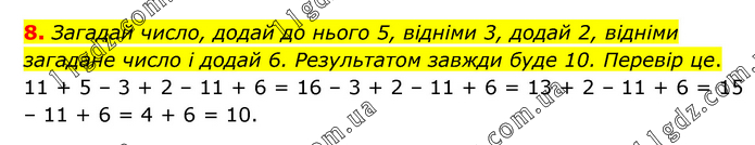 Загадай число, додай до нього 5, відніми 3, додай 2, відніми загадане число і додай 6. Результатом завжди буде 10. Перевір це. 11 + 5 – 3 + 2 – 11 + 6 = 16 – 3 + 2 – 11 + 6 = 13 + 2 – 11 + 6 = 15 – 11 + 6 = 4 + 6 = 10.