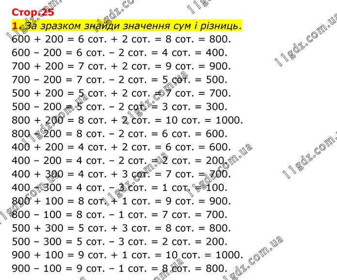 За зразком знайди значення сум і різниць. 600 + 200 = 6 сот. + 2 сот. = 8 сот. = 800. 600 – 200 = 6 сот. – 2 сот. = 4 сот. = 400. 700 + 200 = 7 сот. + 2 сот. = 9 сот. = 900. 700 – 200 = 7 сот. – 2 сот. = 5 сот. = 500. 500 + 200 = 5 сот. + 2 сот. = 7 сот. = 700. 500 – 200 = 5 сот. – 2 сот. = 3 сот. = 300. 800 + 200 = 8 сот. + 2 сот. = 10 сот. = 1000. 800 – 200 = 8 сот. – 2 сот. = 6 сот. = 600. 400 + 200 = 4 сот. + 2 сот. = 6 сот. = 600. 400 – 200 = 4 сот. – 2 сот. = 2 сот. = 200. 400 + 300 = 4 сот. + 3 сот. = 7 сот. = 700. 400 – 300 = 4 сот. – 3 сот. = 1 сот. = 100. 800 + 100 = 8 сот. + 1 сот. = 9 сот. = 900. 800 – 100 = 8 сот. – 1 сот. = 7 сот. = 700. 500 + 300 = 5 сот. + 3 сот. = 8 сот. = 800. 500 – 300 = 5 сот. – 3 сот. = 2 сот. = 200. 900 + 100 = 9 сот. + 1 сот. = 10 сот. = 1000. 900 – 100 = 9 сот. – 1 сот. = 8 сот. = 800.