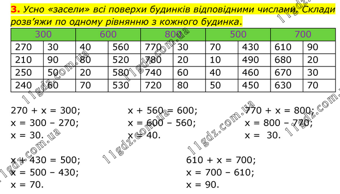 Усно «засели» всі поверхи будинків відповідними числами. Склади розв’яжи по одному рівнянню з кожного будинка.