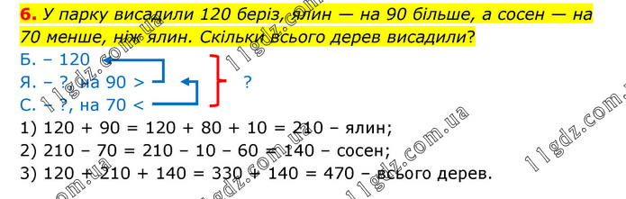 У парку висадили 120 беріз, ялин — на 90 більше, а сосен — на 70 менше, ніж ялин. Скільки всього дерев висадили? Б. – 120 Я. – ?, на 90 > ? С. – ?, на 70 < 1) 120 + 90 = 120 + 80 + 10 = 210 – ялин; 2) 210 – 70 = 210 – 10 – 60 = 140 – сосен; 3) 120 + 210 + 140 = 330 + 140 = 470 – всього дерев.