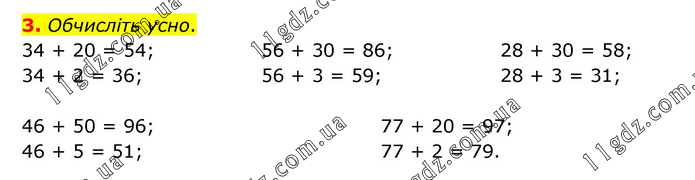 Обчисліть усно. 34 + 20 = 54; 34 + 2 = 36; 56 + 30 = 86; 56 + 3 = 59; 28 + 30 = 58; 28 + 3 = 31; 46 + 50 = 96; 46 + 5 = 51; 77 + 20 = 97; 77 + 2 = 79.