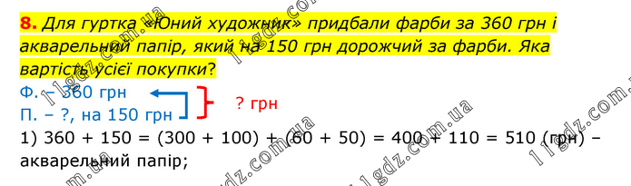 Для гуртка «Юний художник» придбали фарби за 360 грн і акварельний папір, який на 150 грн дорожчий за фарби. Яка вартість усієї покупки? Ф. – 360 грн П. – ?, на 150 грн 1) 360 + 150 = (300 + 100) + (60 + 50) = 400 + 110 = 510 (грн) – акварельний папір;
