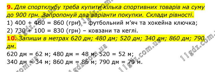 9. Для спортклубу треба купити кілька спортивних товарів на суму до 900 грн. Запропонуй два варіанти покупки. Склади рівності. 1) 400 + 460 = 860 (грн) – футбольний м’яч та хокейна ключка; 2) 730 + 100 = 830 (грн) – ковзани та кеглі. 10. Запиши в метрах 620 дм; 480 дм; 520 дм; 340 дм; 860 дм; 790 дм. 620 дм = 62 м; 480 дм = 48 м; 520 = 52 м; 340 дм = 34 м; 860 дм = 86 м; 790 дм = 79 м.