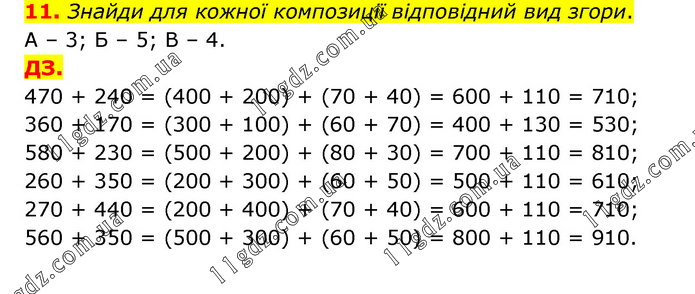 11. Знайди для кожної композиції відповідний вид згори. А – 3; Б – 5; В – 4. ДЗ. 470 + 240 = (400 + 200) + (70 + 40) = 600 + 110 = 710; 360 + 170 = (300 + 100) + (60 + 70) = 400 + 130 = 530; 580 + 230 = (500 + 200) + (80 + 30) = 700 + 110 = 810; 260 + 350 = (200 + 300) + (60 + 50) = 500 + 110 = 610; 270 + 440 = (200 + 400) + (70 + 40) = 600 + 110 = 710; 560 + 350 = (500 + 300) + (60 + 50) = 800 + 110 = 910.