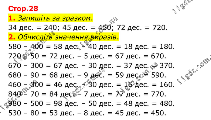 1. Запишіть за зразком. 34 дес. = 240; 45 дес. = 450; 72 дес. = 720. 2. Обчисліть значення виразів. 580 – 400 = 58 дес. – 40 дес. = 18 дес. = 180. 720 – 50 = 72 дес. – 5 дес. = 67 дес. = 670. 670 – 300 = 67 дес. – 30 дес. = 37 дес. = 370. 680 – 90 = 68 дес. – 9 дес. = 59 дес. = 590. 460 – 300 = 46 дес. – 30 дес. = 16 дес. = 160. 840 – 70 = 84 дес. – 7 дес. = 77 дес. = 770. 980 – 500 = 98 дес. – 50 дес. = 48 дес. = 480. 530 – 80 = 53 дес. – 8 дес. = 45 дес. = 450.