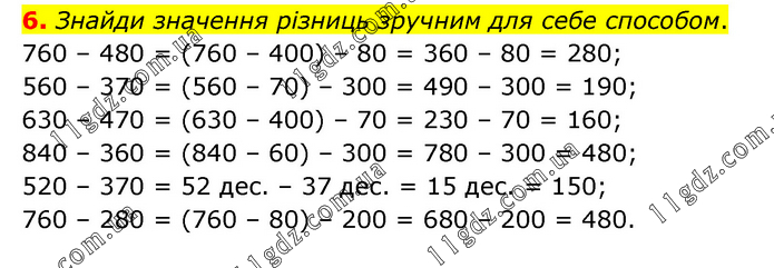 Знайди значення різниць зручним для себе способом. 760 – 480 = (760 – 400) – 80 = 360 – 80 = 280; 560 – 370 = (560 – 70) – 300 = 490 – 300 = 190; 630 – 470 = (630 – 400) – 70 = 230 – 70 = 160; 840 – 360 = (840 – 60) – 300 = 780 – 300 = 480; 520 – 370 = 52 дес. – 37 дес. = 15 дес. = 150; 760 – 280 = (760 – 80) – 200 = 680 – 200 = 480.