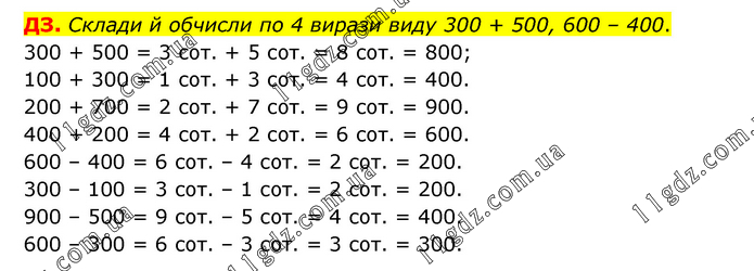 Склади й обчисли по 4 вирази виду 300 + 500, 600 – 400. 300 + 500 = 3 сот. + 5 сот. = 8 сот. = 800; 100 + 300 = 1 сот. + 3 сот. = 4 сот. = 400. 200 + 700 = 2 сот. + 7 сот. = 9 сот. = 900. 400 + 200 = 4 сот. + 2 сот. = 6 сот. = 600. 600 – 400 = 6 сот. – 4 сот. = 2 сот. = 200. 300 – 100 = 3 сот. – 1 сот. = 2 сот. = 200. 900 – 500 = 9 сот. – 5 сот. = 4 сот. = 400. 600 – 300 = 6 сот. – 3 сот. = 3 сот. = 300.